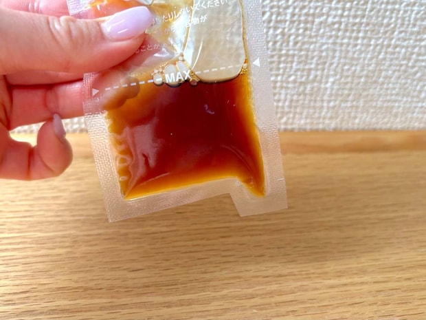 今回はしょうゆを小分けにします。清潔な手でダブルチャック部分を開けて、そそいでいきます。そそぎ終わったらダブルチャックをしっかりと閉めます。漏れ防止のため念入りにチェックしてくださいね。