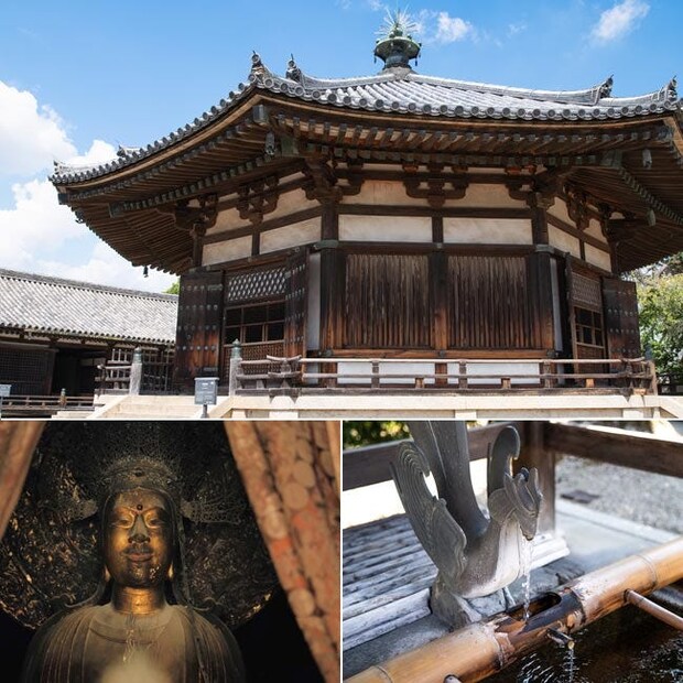 上/八角円堂「夢殿」はどこから観ても美しい。端正な均整美 左下/秘仏・救世観音像。一説では聖徳太子をモデルにしたと言われる慈悲の姿は必見。2025年は10月22日~11月22日で特別開扉される(※) 右下/鳳凰を象った吐水口。境内を満たす清らかな水音が心地いい