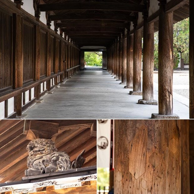 加えて回廊の柱には、まるでブロックではめ込んだような、埋め木の跡があり、それは腐食や傷みを補修しながら大切に使い続けてきた証。代々の宮大工が試行錯誤を重ねてきた息づかいを感じます。こうした細部を見つめると、法隆寺が単なる古建築ではなく、人々の営みによって生かされ続けてきた“生きる遺産”だということを強く感じます。大きな佇まいだけでなく、ディテールに宿る物語もまた歴史の楽しみ方のひとつかも。