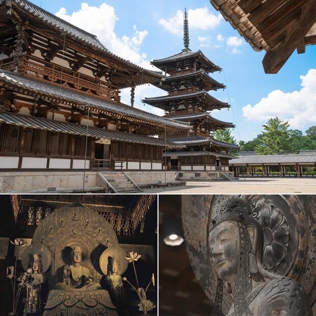 上/五重塔の均整美。上層に向かい小さくなる屋根の重なりが美しい 左下/金堂に安置される釈迦三尊像。ほかにも13体の仏像が安置され、ほとんどが国宝指定(※) 右下/大宝蔵院に収められた百済観音像。自然光に照らされる気品ある立ち姿に思わず圧倒される(※)