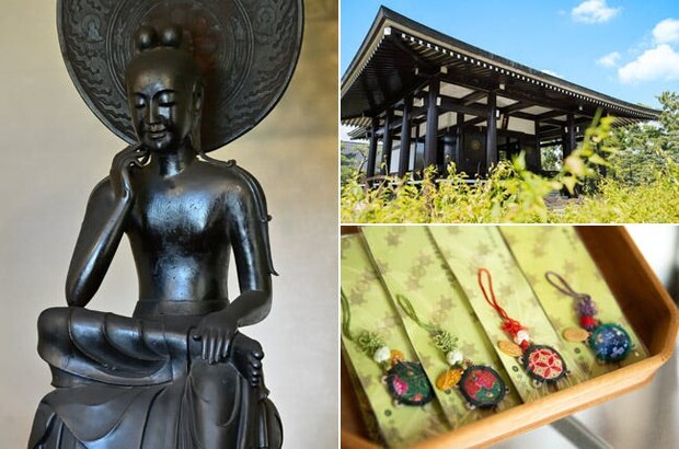 左/本尊・菩薩半跏思惟像。口元にのみ控えめな微笑を浮かべた表情は、飛鳥時代の彫刻に見られる“アルカイックスマイル”と呼ばれる(※) 右上/緑に囲まれた静謐な佇まいの本堂 右下/拝観受付併設の売店にて購入できる亀まもり1000円。鮮やかな刺繍が可憐なお守り