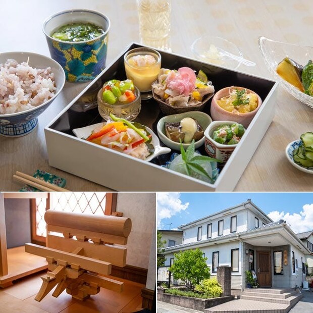 上/創作ランチコースOHACO 3,000円。健康を考えた栄養たっぷりの季節の品が彩る膳は、白い漆器に月替わりの水引をかけて提供 左下/釘を使わない、日本の伝統工法の木組み模型。紡がれてきた匠の技で伝統建造物を守る 右下/白壁と木の看板が目印。町並みに溶け込む外観