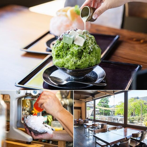 上/挽きたての大和抹茶と手作りの氷蜜を使った大和抹茶かき氷1200円。桃シロップ、自家製の桃のピューレ、桃のコンポートをたっぷり使った桃かき氷1300円 左下/氷を削る音が店内に心地よく響く 右下/奈良の工芸品・赤膚焼の器や吉野杉の家具に囲まれた和の空間