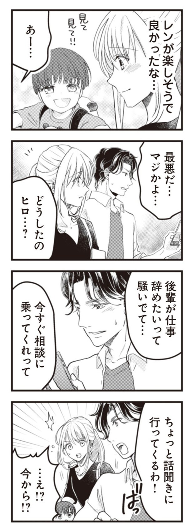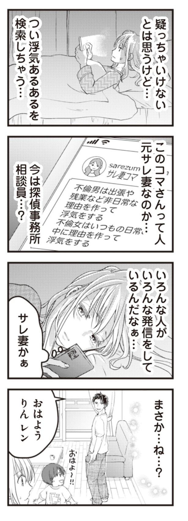 第2子を妊娠して幸せ絶頂の妻、りん。ある日、4歳の長男レンが「またあのお兄ちゃんと遊びたい」と口にしたが、そのことを夫のヒロから口止めされているのを知り、夫の露呈する怪しい行動に違和感を抱く。一方、別の家庭では、夫のだいきに不倫疑惑が浮上! 妻のかほは、夫の疑惑を払拭するために探偵に調査を依頼するが……? サレ妻を描いた「ママに内緒だよ」と「クズ夫が実家に女を連れ込んでいました」の2つのストーリーから全12回連載でお届けします。