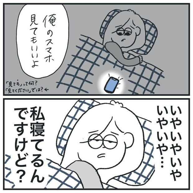 「俺のスマホ見てもいいよ」と、寝ているヒマ子さんの布団に、彼氏のスマホが置かれました。ヒマ子さんはまったく興味がなさそうです。