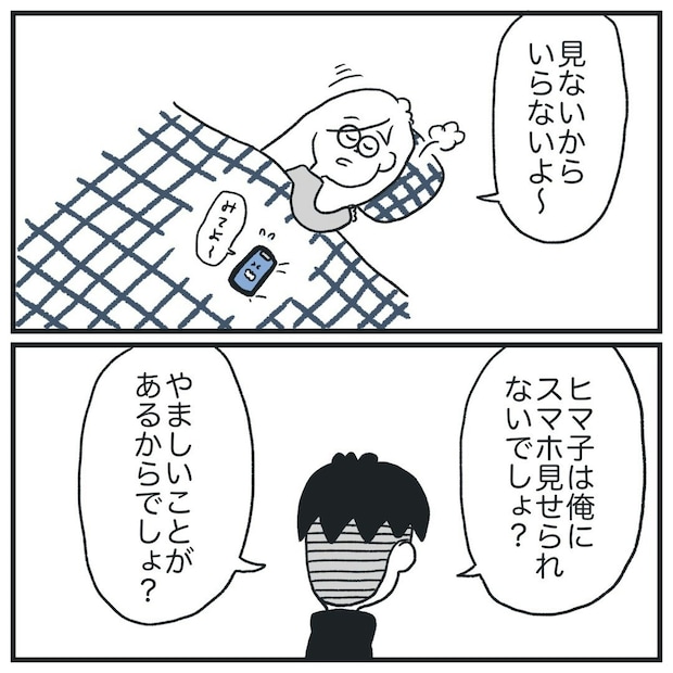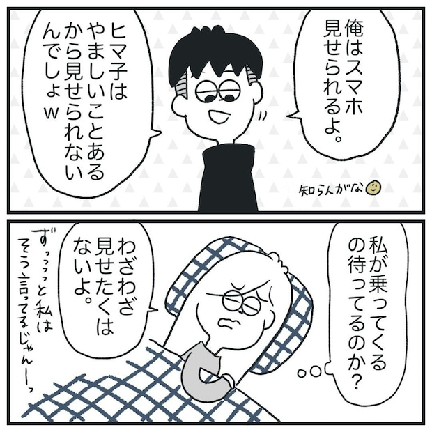 「見ないからいい」と言うヒマ子さんに「ヒマ子が見せられないのはやましいところがあるからだ」と煽る彼氏。ヒマ子さんはずっと「見せたくない」と断っていたようです。