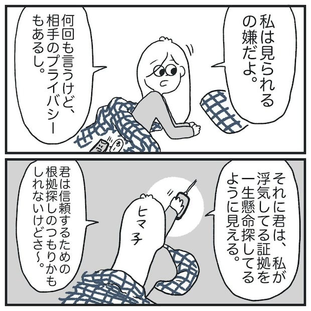 「スマホを見たいのは、浮気の証拠が何もないことを確認して信頼したいからだ」と主張する彼氏でしたが、ヒマ子さんには彼氏が不安の種をわざわざ探しているようにしか見えません。それでも素直に「スマホが見たい」と認めた彼氏に、ヒマ子さんは不本意ながらもスマホを見せることにしました。