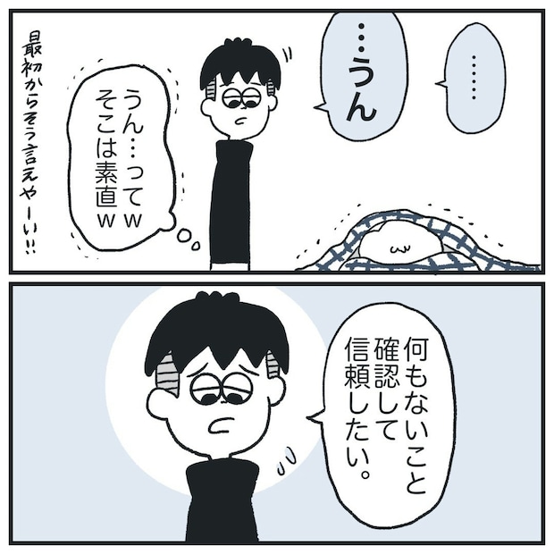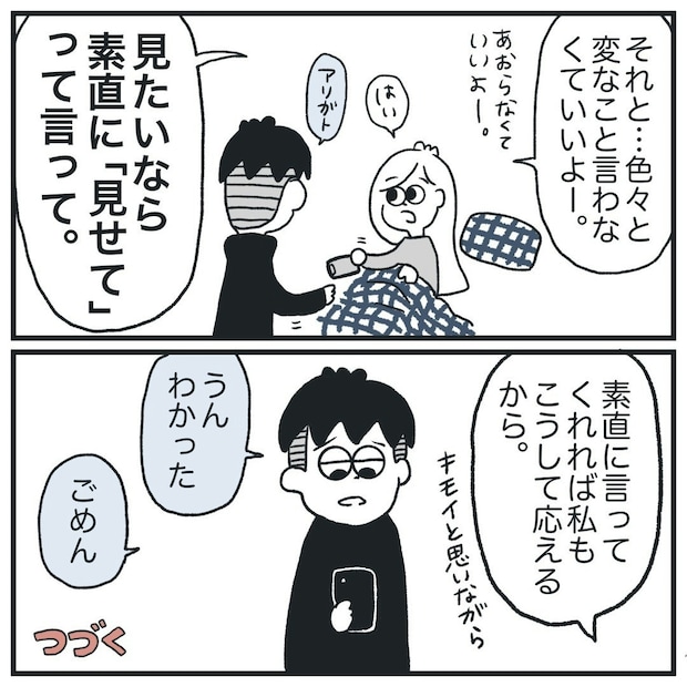 彼氏が執拗にヒマ子さんのスマホを見たがるのは「何もないことを確認して信頼したいから」だと言います。煽るのをやめ、素直に「スマホが見たい」と認めました。