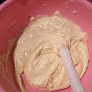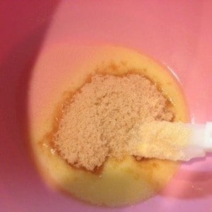 1.タルト生地を作るバターを湯煎で溶かし、砂糖や薄力粉などを入れて混ぜていきます。