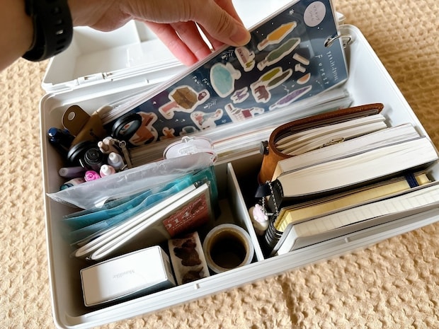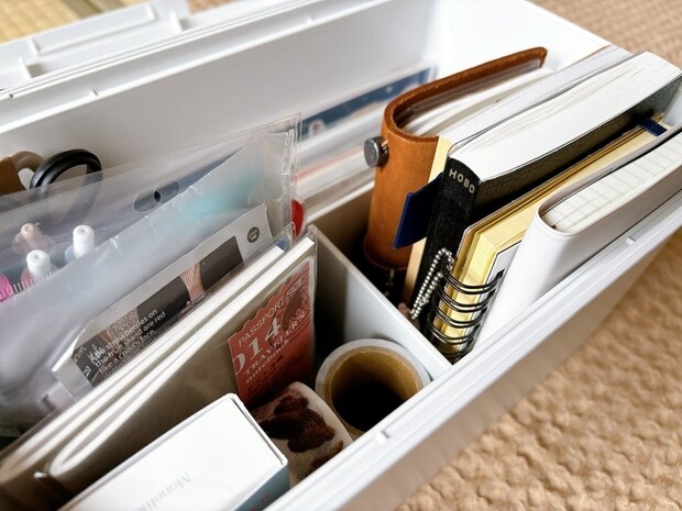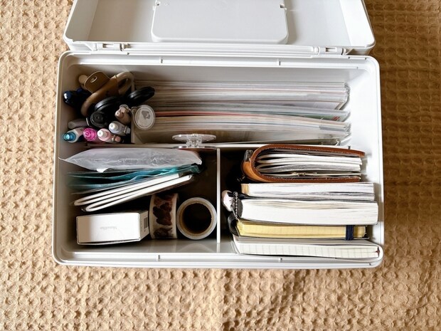無印の救急箱に文具と手帳入れてみたところ、スッキリ収まったというkinaさん。救急箱はパッと必要な物が取り出せるよう考えられているので、細々とした物の整理整頓にピッタリ!文房具や手帳、クラフトなどが好きな方は特に助かりますね。