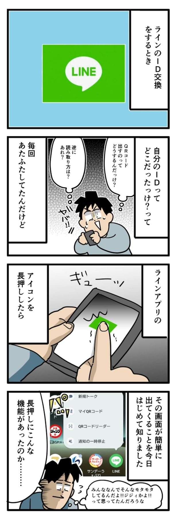 投稿者・ロッテンマイヤー@日記漫画(@y7LuoTv8SJ4eZrJ)さんは、LINEのID交換に毎回あたふたしてしまっていたそう。ある日のショートカット機能の気づきを日記漫画にし投稿。その有益な情報に「知らなかった!」と注目が集まりました。
