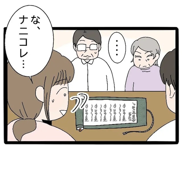 1人で手際よく食事の準備を進めるみずほ先輩に感心した隆明は、「カオリさんのご実家は、しっかり指導されているんですね!これならうちの母も喜ぶと思います」と、何やら意味深な言葉を口にしました。そして、カバンの中から年季の入った巻物のようなものを取り出したのです。