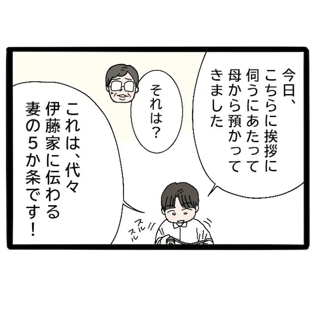「今日こちらに挨拶に伺うにあたって母から預かってきました」隆明はそう言うと、スルスルと巻物を広げ始めました。父が怪訝そうな表情で「それは?」とたずねると、隆明は胸を張って「これは、代々伊藤家に伝わる妻の5か条です!」答えます。