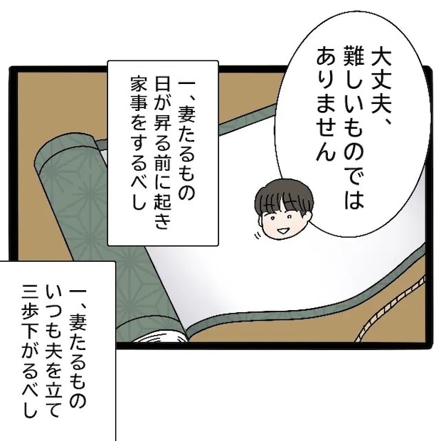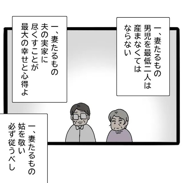 一つ、妻たるもの男児を最低二人は産まなくてはならない。一つ、妻たるもの夫の実家に尽くすことが最大の幸せと心得よ。一つ、妻たるもの姑を敬い必ず従うべし。あまりに時代錯誤な内容に、父も母も言葉を失い、啞然とした表情で固まってしまいました。