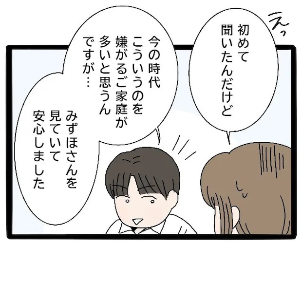 「えっ、初めて聞いたんだけど」と驚く私を無視して、隆明は勝手に話を進めます。「今の時代、こういうのを嫌がるご家庭が多いと思うんですが・・・みずほさんを見ていて安心しました」