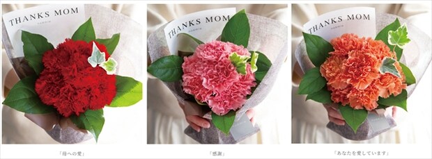 レッド(母への愛)、ピンク(感謝)、オレンジ(あなたを愛しています)など、花言葉に合わせて色を選べます。