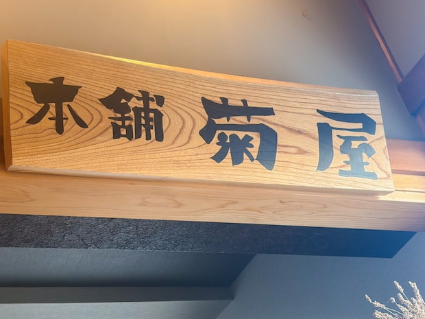 実はこの店舗で昔、店主のおじい様が「きくや」という和菓子屋さんをやっていたそうです。その時使っていた看板が店内に飾られていました。2階に上がるときにふと目に入ります。