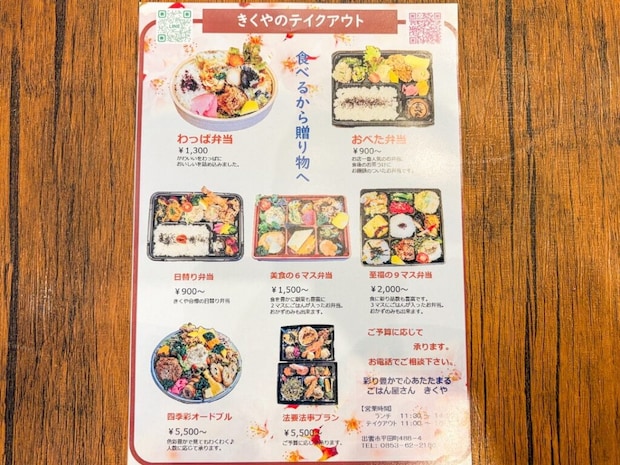 テイクアウトメニューも彩りが鮮やかです。自分で食べることはもちろん、お土産や贈り物に喜ばれそうですね。出雲市内は配達サービスがあります。(要問合せ)
