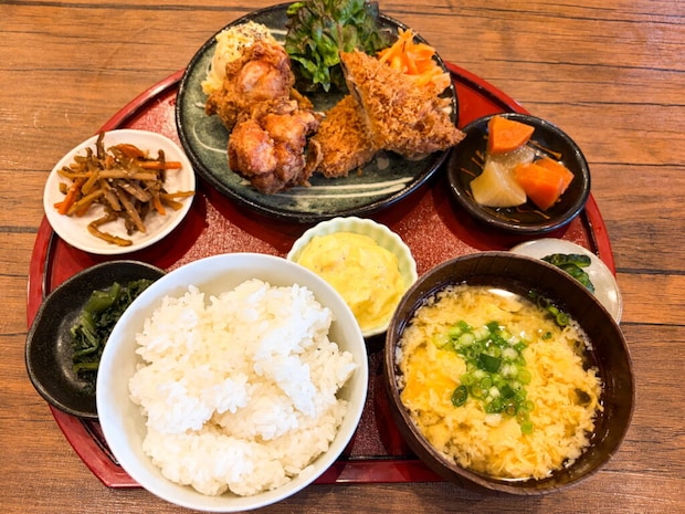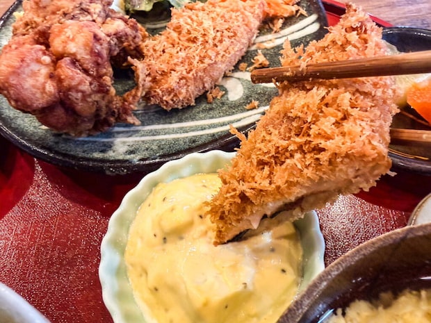 今回は、唐揚げ以外に3種類のフライから1つ選べるボリュームたっぷりのきくや定食(1650円)をいただきました。「白身フライ・アジフライ・サーモンフライ」の中から私はサーモンフライにしました!
