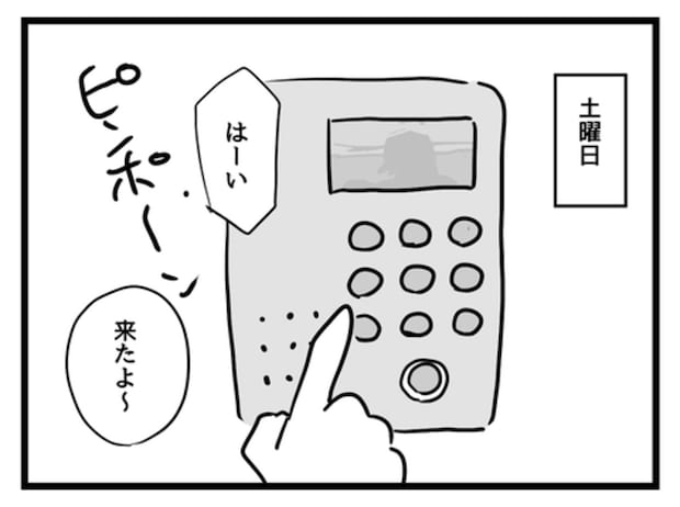りさの家に遊びに行く日がやってきました。はるか親子を迎えたのは、寝坊してまだパジャマ姿のりさでした。
