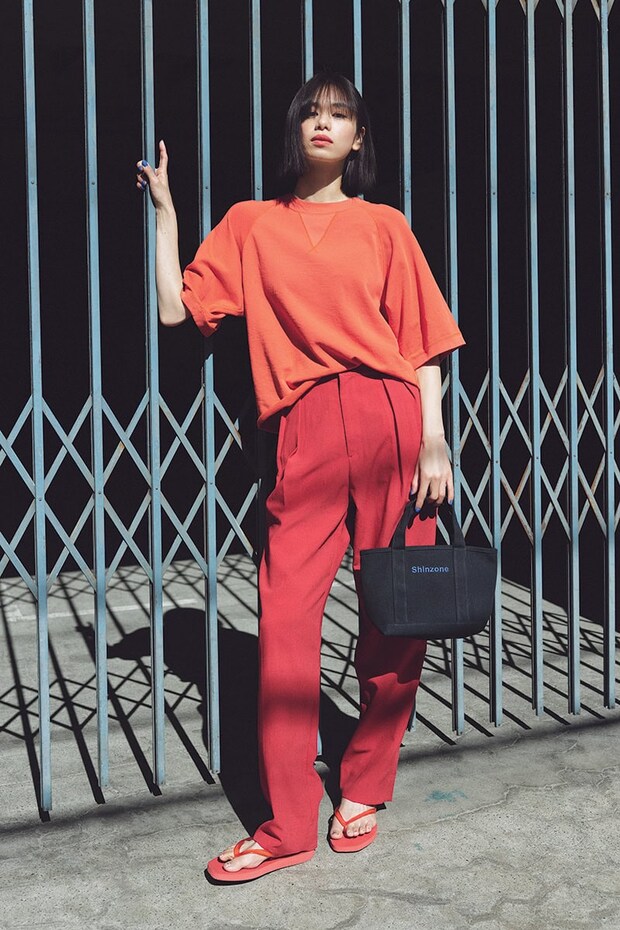 赤をベースにトーンオントーンでまとめた着こなしは、カジュアルなアイテムで適度にヌケ感を演出するのが洒落るポイント。トップス¥15,950、パンツ¥25,300※共に5月上旬発売予定(共にザ シンゾーン/シンゾーン 表参道本店)、ビーサン¥7,700(スリーパーズ/リトルリーグ インク)、トートバッグはオトナミューズ5月号付録