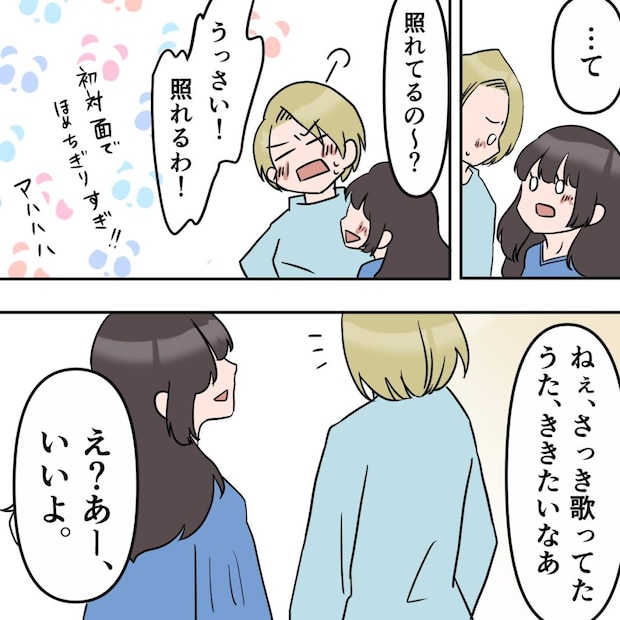 そんな私を見たサユリはくすっと笑い、「て、照れてるの~?」とからかってきました。初めて会ったはずなのに、不思議と距離を感じることもなく、最初から一緒にいるのが自然でとても居心地がよかったのを覚えています。その後、お互いのことを話しながら歩いていると、サユリがふと「さっき歌ってたうた、ききたいなぁ」とリクエストしてくれました。
