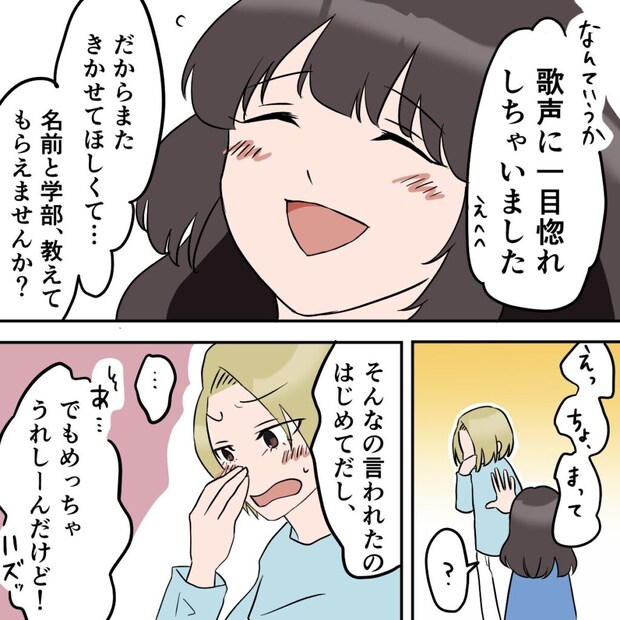 サユリは照れながら「なんていうか、歌声に一目惚れしちゃいました!だからまた聴かせてほしくて・・・名前と学部、教えてもらえませんか?」と控えめにたずねてきました。そんなふうに言われたのは生まれて初めてで、思わず顔が熱くなる私。気の利いた言葉も出てこず、「めっちゃうれしーんだけど!」と、照れ隠しのような返事をしてしまいました。