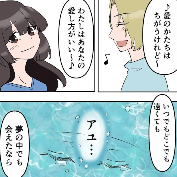 愛のかたちはちがうけれど私はあなたの愛し方がいい。いつでもどこでも遠くても夢の中でも会えたならー・・・この歌は、私にとってもサユリにとっても大切な曲。この曲を歌うたび、自然とサユリのことを思い出します。そんなことを考えていると、ふと誰かに名前を呼ばれたような気がしました。