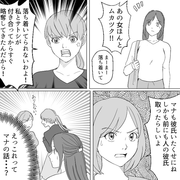 ある日、サオリが校内を歩いていると「マナに彼氏を略奪された」という話が聞こえてくる。マナの衝撃の噂に、驚くサオリ。