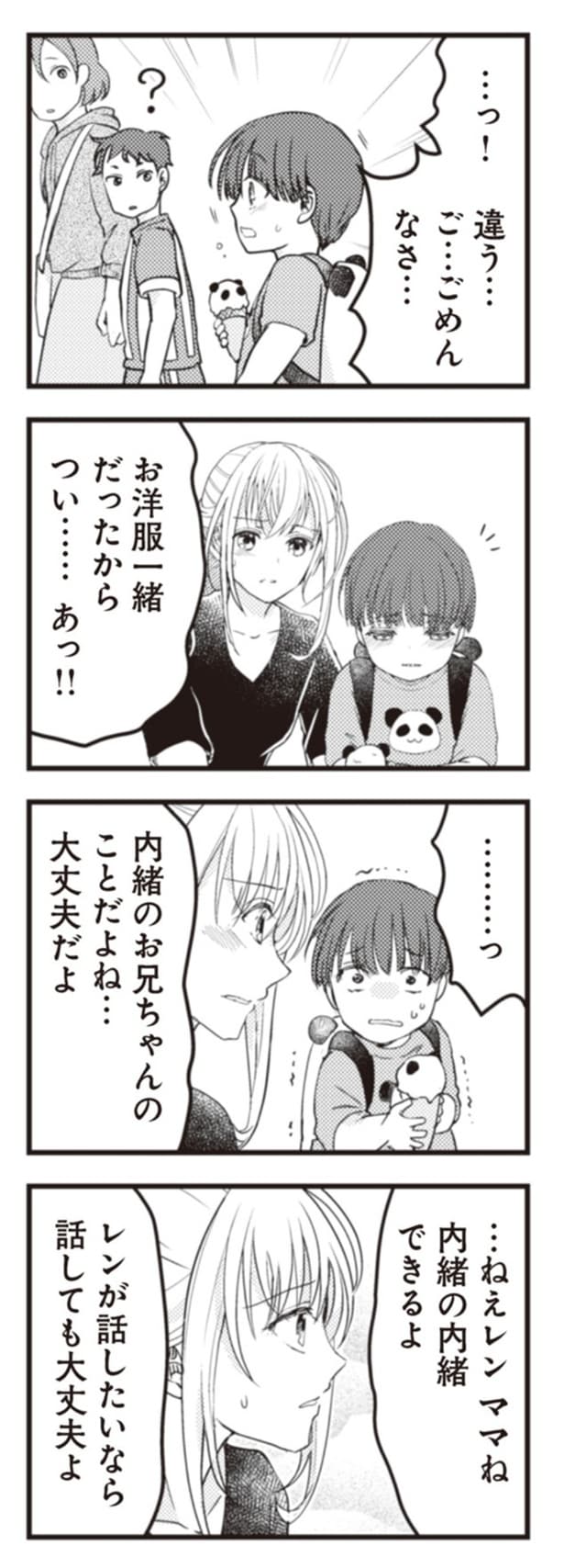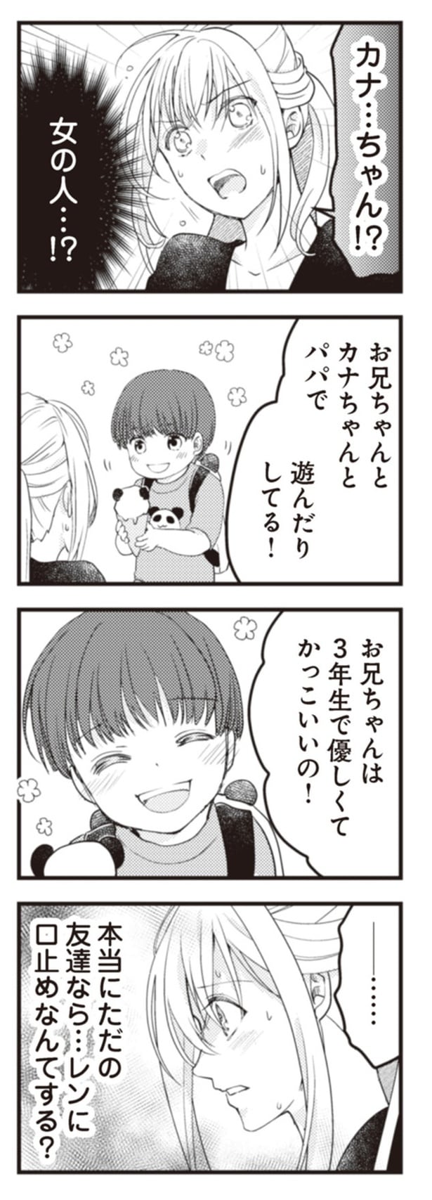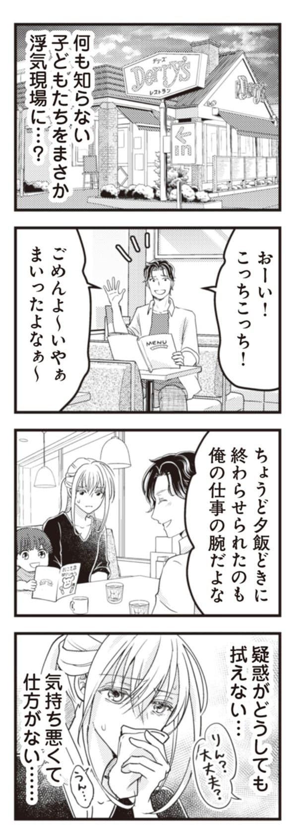 第2子を妊娠して幸せ絶頂の妻、りん。ある日、4歳の長男レンが「またあのお兄ちゃんと遊びたい」と口にしたが、そのことを夫のヒロから口止めされているのを知り、夫の露呈する怪しい行動に違和感を抱く。一方、別の家庭では、夫のだいきに不倫疑惑が浮上! 妻のかほは、夫の疑惑を払拭するために探偵に調査を依頼するが……? サレ妻を描いた「ママに内緒だよ」と「クズ夫が実家に女を連れ込んでいました」の2つのストーリーから全12回連載でお届けします。