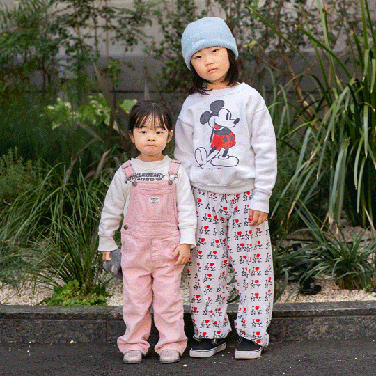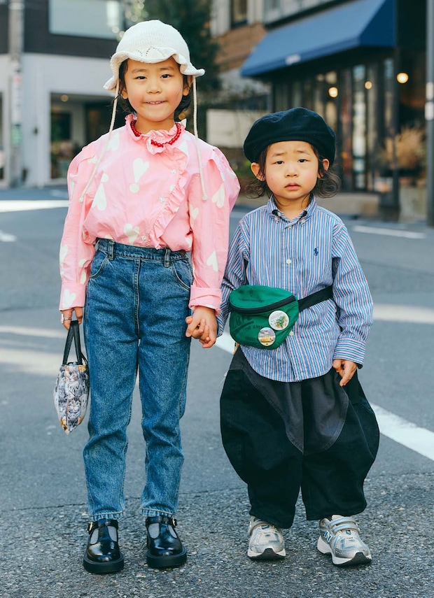 定番デニムを『ビューラブズ』のハート柄ラッフルシャツで華やかにアップデートしたひーちゃんと、トレンドのバルーンパンツに『ラルフローレン』のシャツを合わせたしっくん。異なるシルエットやデザインも、シャツ×パンツのスタイリングでまとまり感アップ。ハットやウエストポーチなど小物使いにも注目!
