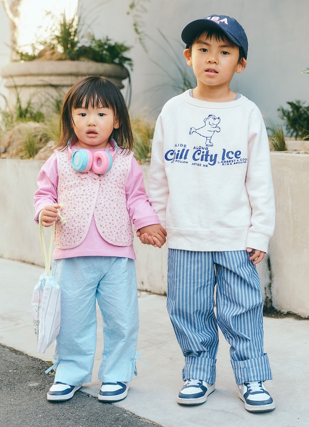 お兄ちゃんはブルーを軸に、アイコニックなスウェットとUSAロゴのキャップでアクセントを加えたストリートカジュアル。りいちゃんは、リボン刺しゅうのブルーパンツに花柄ジレを重ねたラブリーな装い。テイストは異なりつつも、足元は『ナイキ』の「コート ボロー」でさりげなくリンク。きょうだいらしいバランスのよさがグッド!