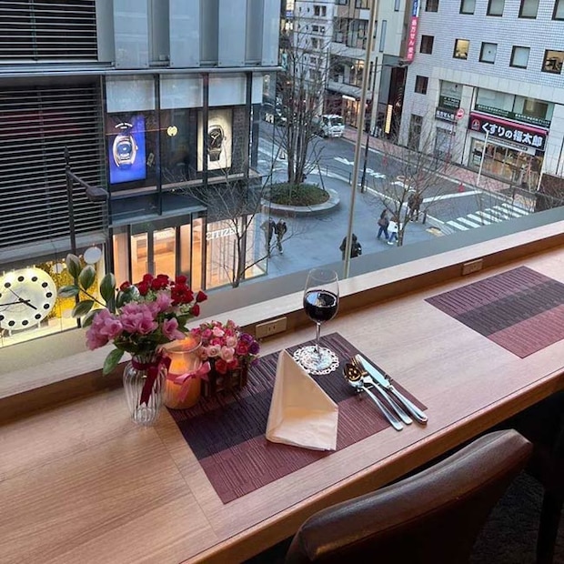 おひとりさま専用のランチプランでは、コンセント付きのカウンター席を確約。目の前には大きな窓を配し、銀座の街並みを眺めながら開放的な気分に。Wi-Fiも完備されているので、動画を見たり、軽く作業を進めたりするのにも最適。