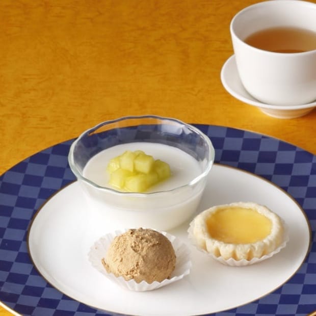 アフタヌーンティーに必要不可欠なスイーツは盛り合わせでご用意。中国料理「大観苑」で愛されているスイーツが一同に楽しめるのがうれしいポイント。杏仁の軽やかな香りとメロンの甘さが引き立つ人気の「杏仁プリン」や、香ばしい胡麻の味わいと口に残るもちっとした食感の「胡麻あんきな粉もち」など、王道チャイニーズスイーツが並ぶ。