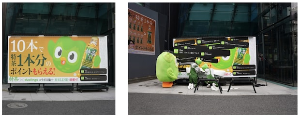 「伊右衛門 特茶」と「Duolingo」のコラボ企画として、あの緑のキャラクター・デュオくんが屋外広告の「上書き」を実施するという情報を得ました。記者は何が起こるのか分からぬまま現地へ急行。そこで目にしたのは、異色すぎる光景です。