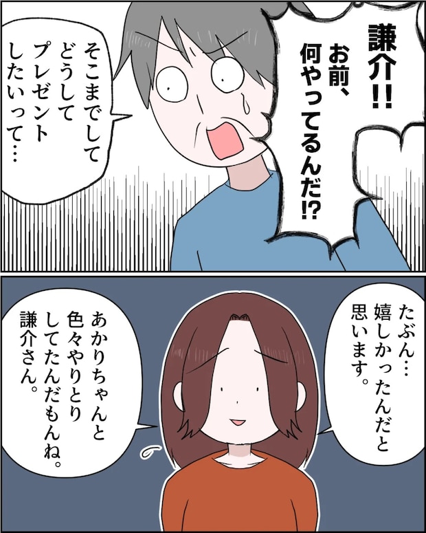 謙介の悪事を聞いた義父は、案の定「謙介!お前何やってるんだ!?そこまでしてどうしてプレゼントしたいって・・・」と声を荒げます。私はすかさず「たぶん嬉しかったんだと思います、あかりちゃんと色々やりとりしてたもんね」と理解ある妻を装いながら、しっかりと核心を突く一言を添えました。