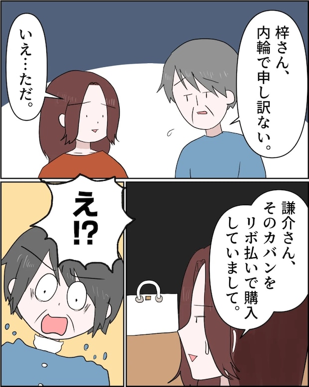 「梓さん、内輪で申し訳ない」そう謝る義父に、私は「いえ・・・ただ謙介さん、そのカバンをリボ払いで購入していまして」と付け加えます。まさかリボ払いにまで手を出していたと思わなかったのか、義母は「え!?」と目を見開きました。