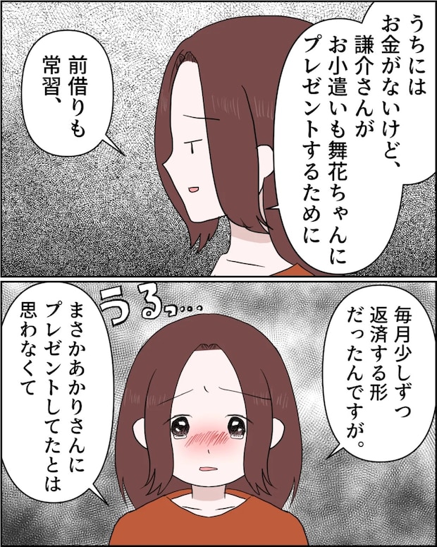 私は続けて「うちにはお金がないけど、謙介さんがお小遣いも舞花ちゃんにプレゼントするために前借りも常習・・・毎月少しずつ返済する形だったんですが、まさかあかりさんにプレゼントしてたとは思わなくて」と、これまで謙介が重ねてきた悪事を包み隠さず明かしました。