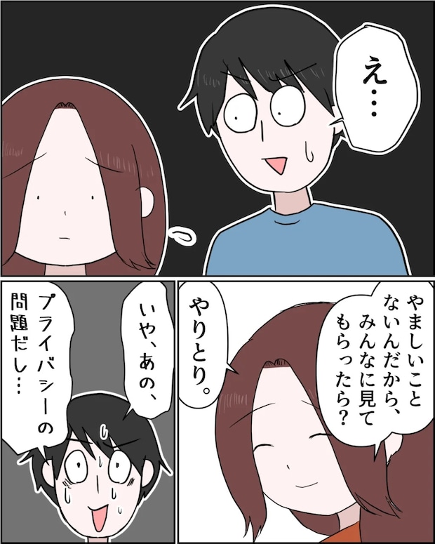 謙介は嫌な予感がしたのか、「え・・・」と表情を強張らせます。私は彼のほうにゆっくり振り向くと「やましいことないんだから、みんなに見てもらったら?やりとり」と、にこやかに微笑みます。すると謙介は、「いや、あの、プライバシーの問題だし・・・」と、急にしどろもどろになりました。