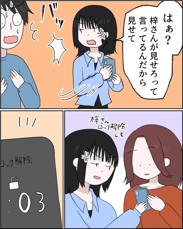 すると舞花ちゃんが、「はぁ?梓さんが見せろって言ってるんだから見せて」と苛立った様子で謙介のスマホを半ば強引に取り上げました。そしてそのまま、「梓さんロック解除して」と私に向かって差し出してきたのでした。