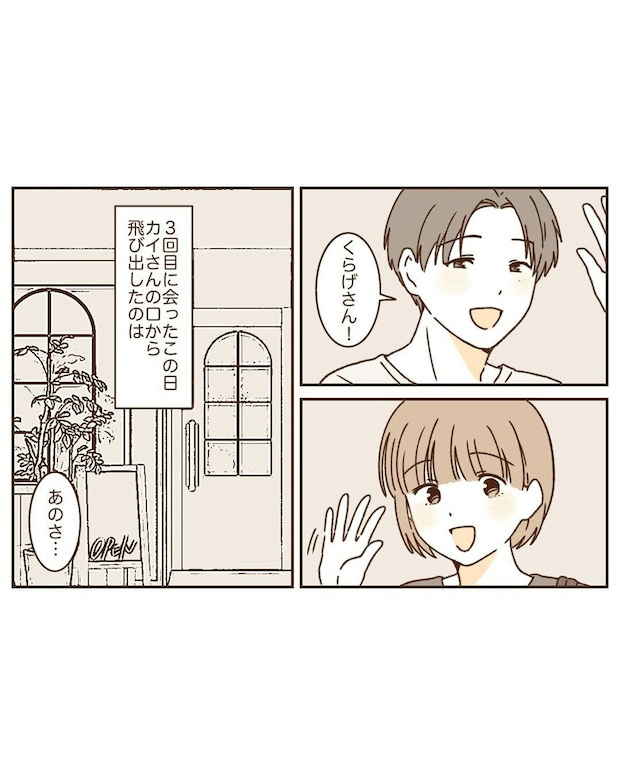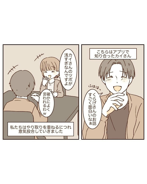 くらげさんは、マッチングアプリで知り合ったカイさんとすぐに意気投合し、デートもとても楽しく過ごしました。