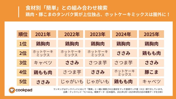 さらに「簡単」と食材を組み合わせた検索の変化を見ると家庭のニーズの変遷が浮き彫りになります。