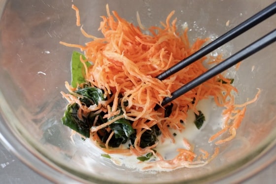 にんじんは細切りに、わかめはしっかり水気を絞って