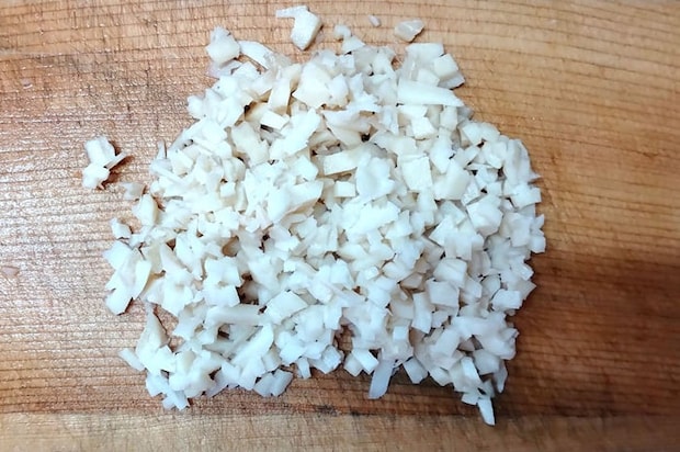 2. 玉ねぎの全量とれんこんの約半量はみじん切りに、残りのれんこん、しょうがはすりおろす。