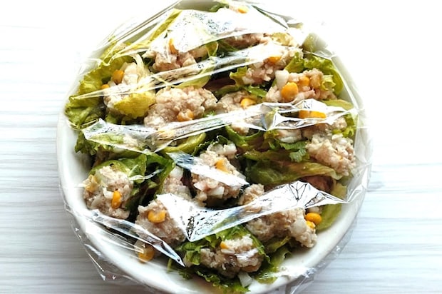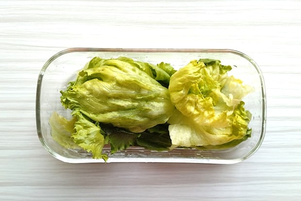 1. レタスは手のひらくらいの大きさにちぎって耐熱皿にのせ、ラップをして電子レンジ(600W)で50秒加熱する。