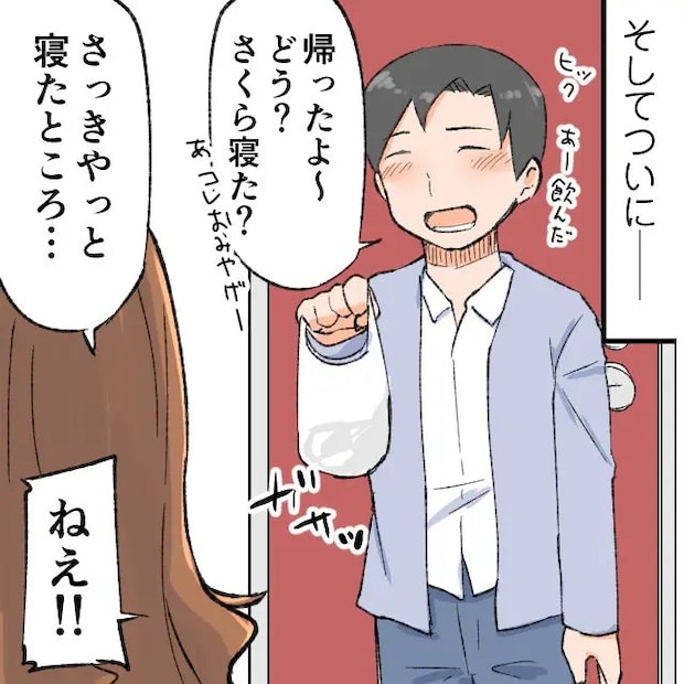 「帰ったよ~。どう?さくら寝た?あ、コレおみやげ~」そう言ってお土産を差し出す俺に、「さっきやっと寝たところ・・」そう言った後、ゆきのが「ねえ!!」と大きな声を出しました。