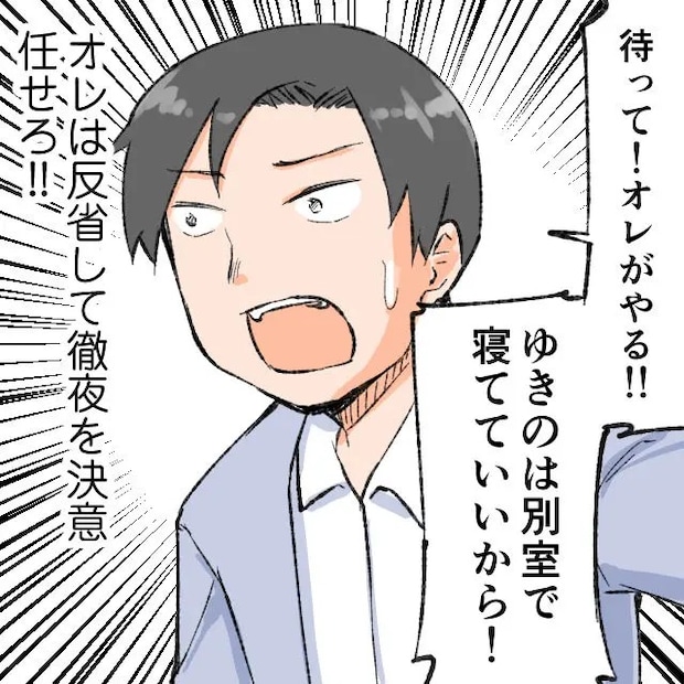 妻ゆきのさんとの間に待望の第一子さくらちゃんが誕生。できる夫として、これからは妻のサポートを全力で頑張ろうと意気込んでいたものの、夜になるとさくらちゃんがどれだけ泣いても起きない夫。そのおかげでゆきのさんは、ひとりきりで授乳と寝かしつけをこなすのでした。にもかかわらず、仕事から帰ると「今日特に用事なかったでしょ」と晩ご飯の準備ができていないことに不満げな夫。夜泣きで一睡もできていないと伝えると交代するから起こしてと言うものの、いざ夜泣きが始まり夫に声をかけても全く起きる気配はありませんでした。