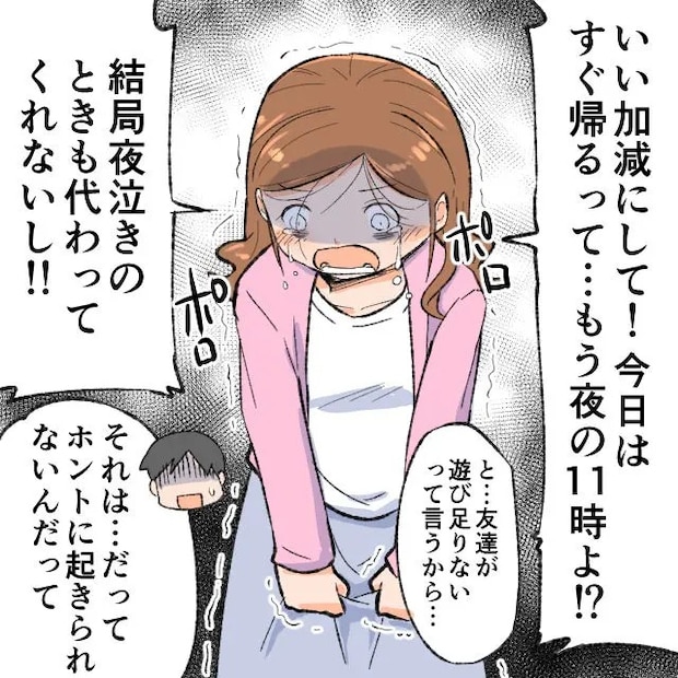 「いい加減にして!今日はすぐ帰るって・・もう夜の11時よ!?」と怒り出すゆきのに「と・・友達が遊び足りないって言うから・・」恐る恐るそう言うと、「結局夜泣きのときも代わってくれないし!!」そう言ってポロポロと涙を流すゆきの。「それは・・だってホントに起きられないんだって」俺はそう言った後、