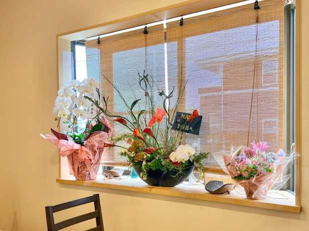 オープンしたばかりということもあり、お祝いの花が飾られています。