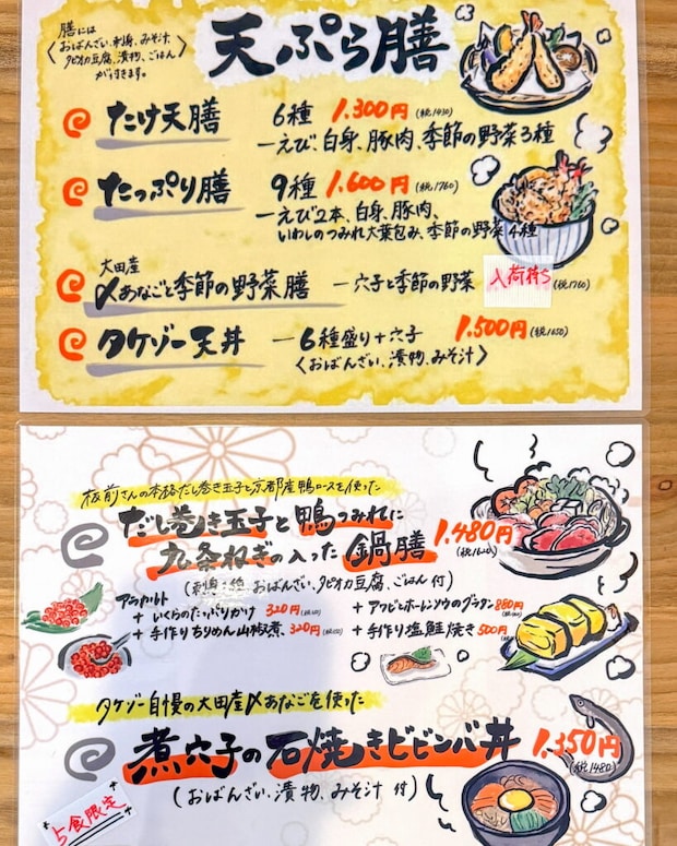 お客様の多くが、6種類の天ぷらが付いた「たけ天膳」を注文されるそうで、きっと人気のランチなのでしょうね。